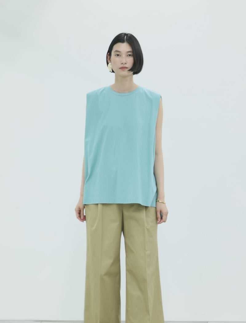 タック入りのスクエアショルダーと、程よく広がるシルエットが特徴の定番タンクトップ。