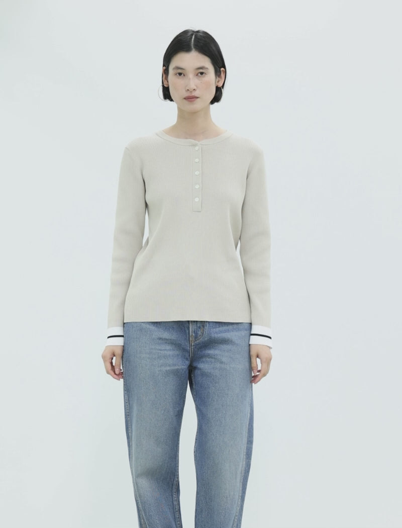デザインはベーシックなヘンリーネックをベースに、袖口の配色をさりげないアクセントとしてプラス。