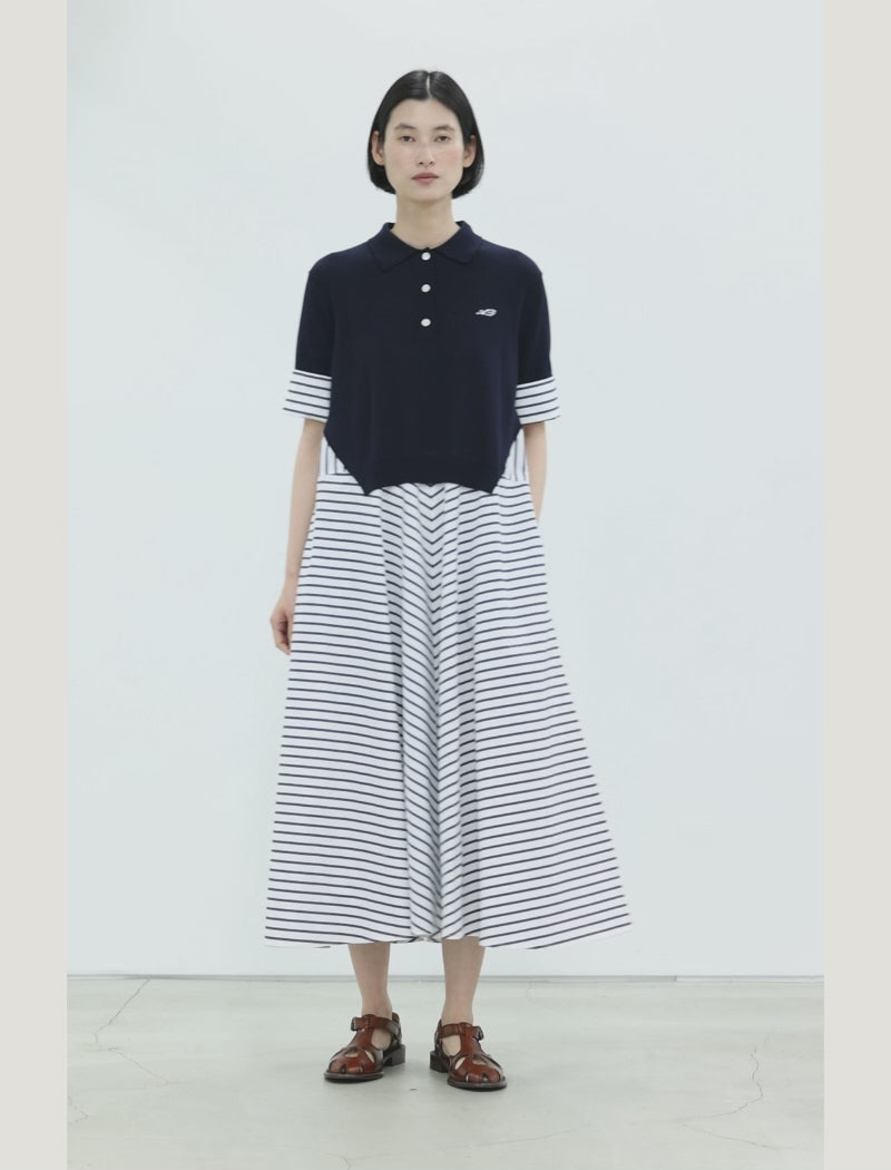 ハイツイストコットンを使用したポロニットに、ストライプの布帛生地をドッキングしたワンピース。